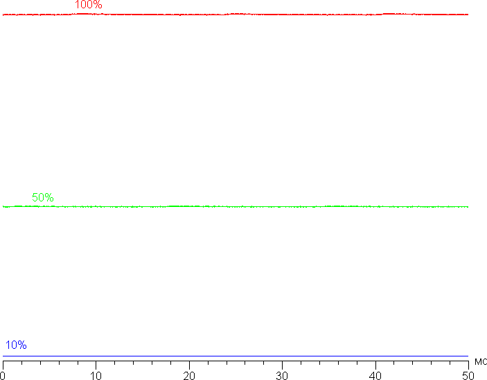 На любом уровне яркости значимая модуляция подсветки отсутствует, поэтому нет и никакого мерцания экрана. В доказательство приведем графики зависимости яркости (вертикальная ось) от времени (горизонтальная ось) при различных значениях настройки яркости: