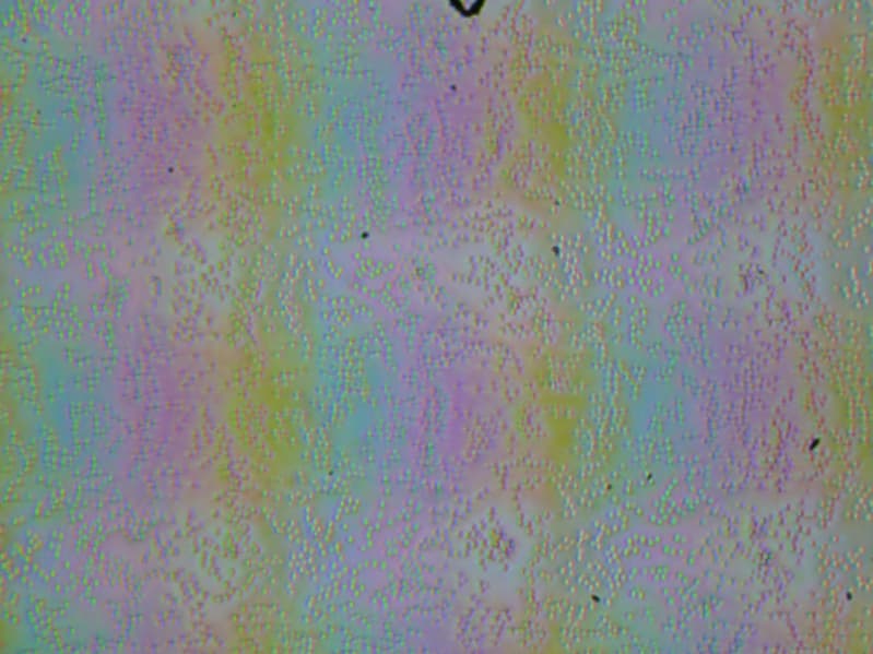 Зерно этих дефектов в несколько раз меньше размеров субпикселей (масштаб этих двух фотографий примерно одинаковый), поэтому фокусировка на микродефектах и «перескок» фокуса по субпикселям при изменении угла зрения выражены слабо, из-за этого нет и «кристаллического» эффекта.