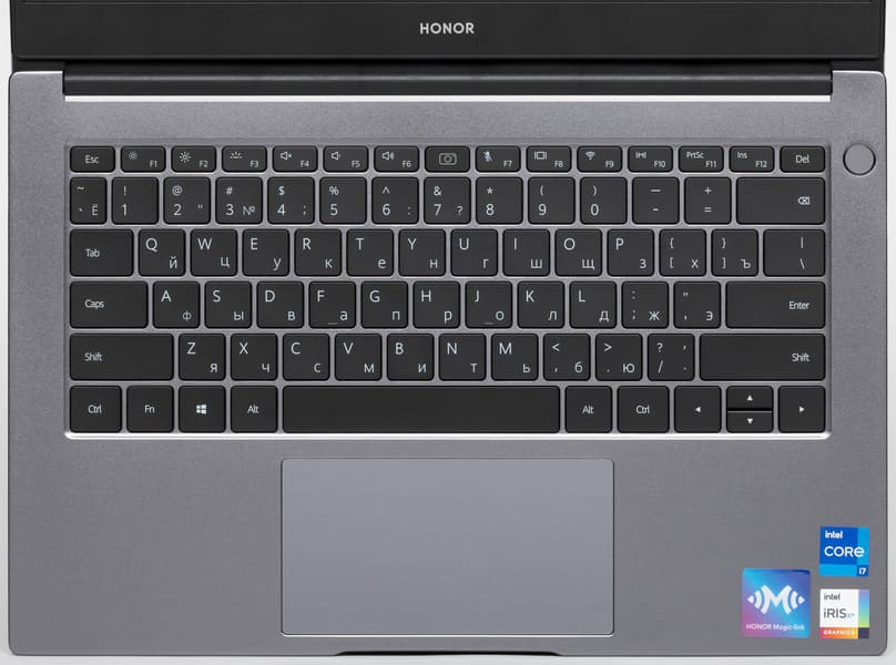 С учетом того, что концепция нового Honor MagicBook 14 не изменилась, нужно ли говорить, что и устройства ввода ноутбука не претерпели изменений? Клавиатура здесь мембранного типа без блока цифровых клавиш, равно как и без столбика с удобными PgUp и PgDn, для которого явно хватило бы места.