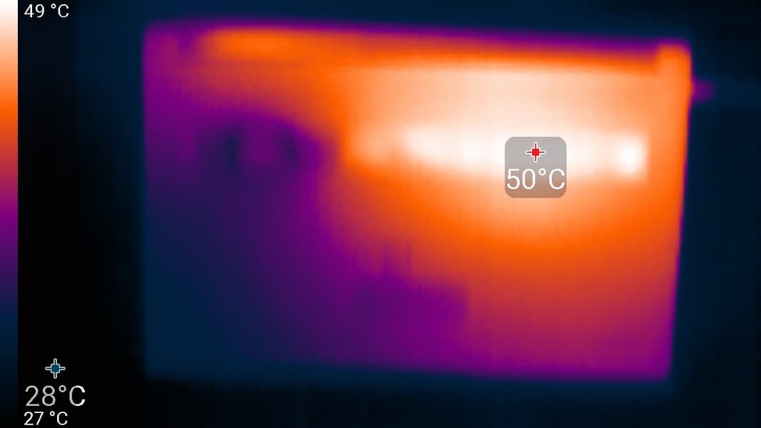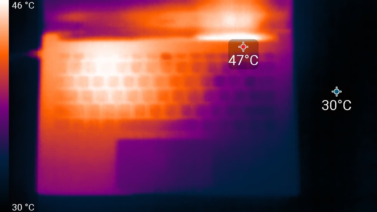 Ниже приведены термоснимки, полученные после долговременной работы ноутбука под максимальной нагрузкой на CPU и GPU (профиль Производительность; используется комплектный блок питания):