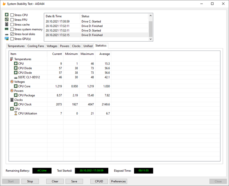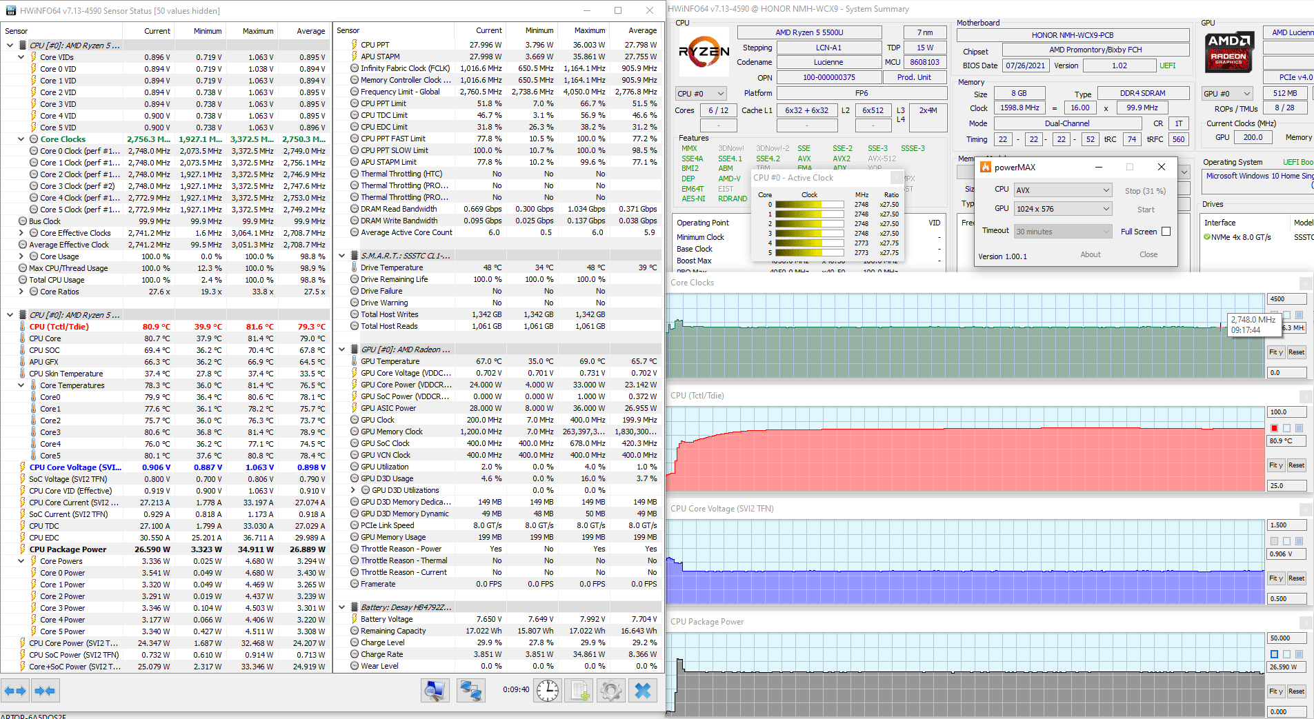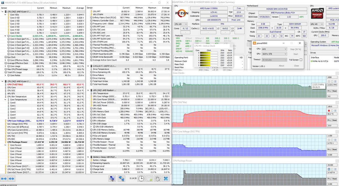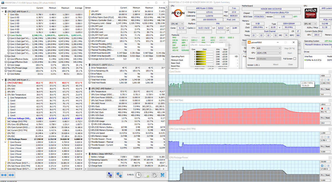 Как и в прошлой статье, стресс-тест процессора ноутбука мы проводили с помощью утилиты powerMax (с использованием AVX-инструкций) при питании от комплектного адаптера, а также при питании от аккумулятора. Мониторинг осуществлялся с помощью утилиты HWinfo64, а температура в помещении во время теста составляла 24 °C. Результаты стресс-тестов ноутбука при работе от электросети приведем на двух скриншотах.
