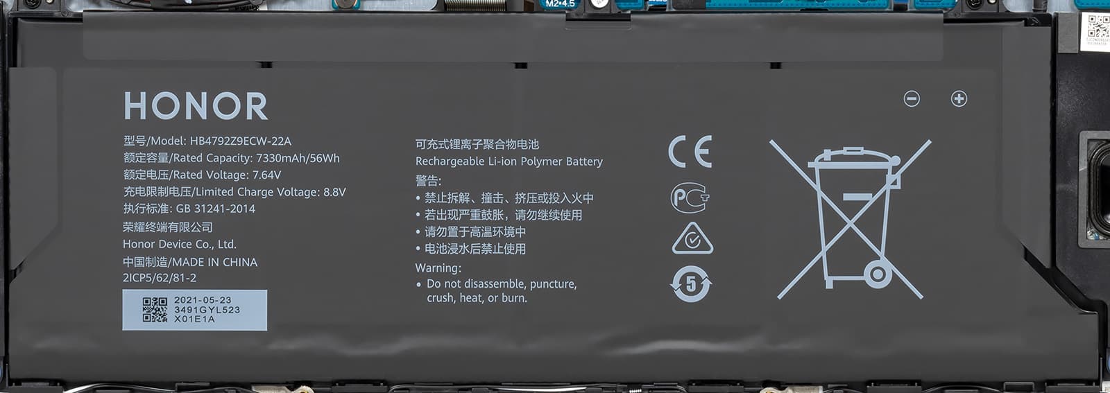 Адаптер питания и аккумулятор у Honor MagicBook 14 и MagicBook 15 полностью одинаковые. Адаптер HN-200325EP0 имеет мощность 65 ватт (20,0 В, 3,25 А), он подключается кабелем с разъемами USB Type-C к соответствующему порту ноутбука.