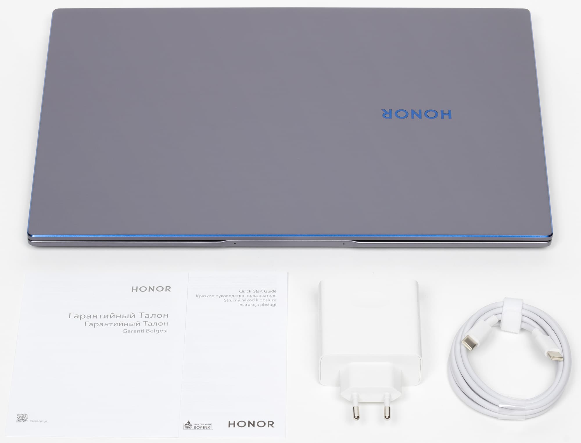 Кроме ноутбука в коробке находятся гарантийный талон, краткое руководство пользователя, адаптер питания и USB-кабель.