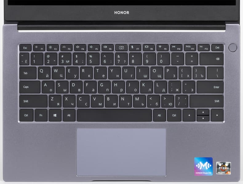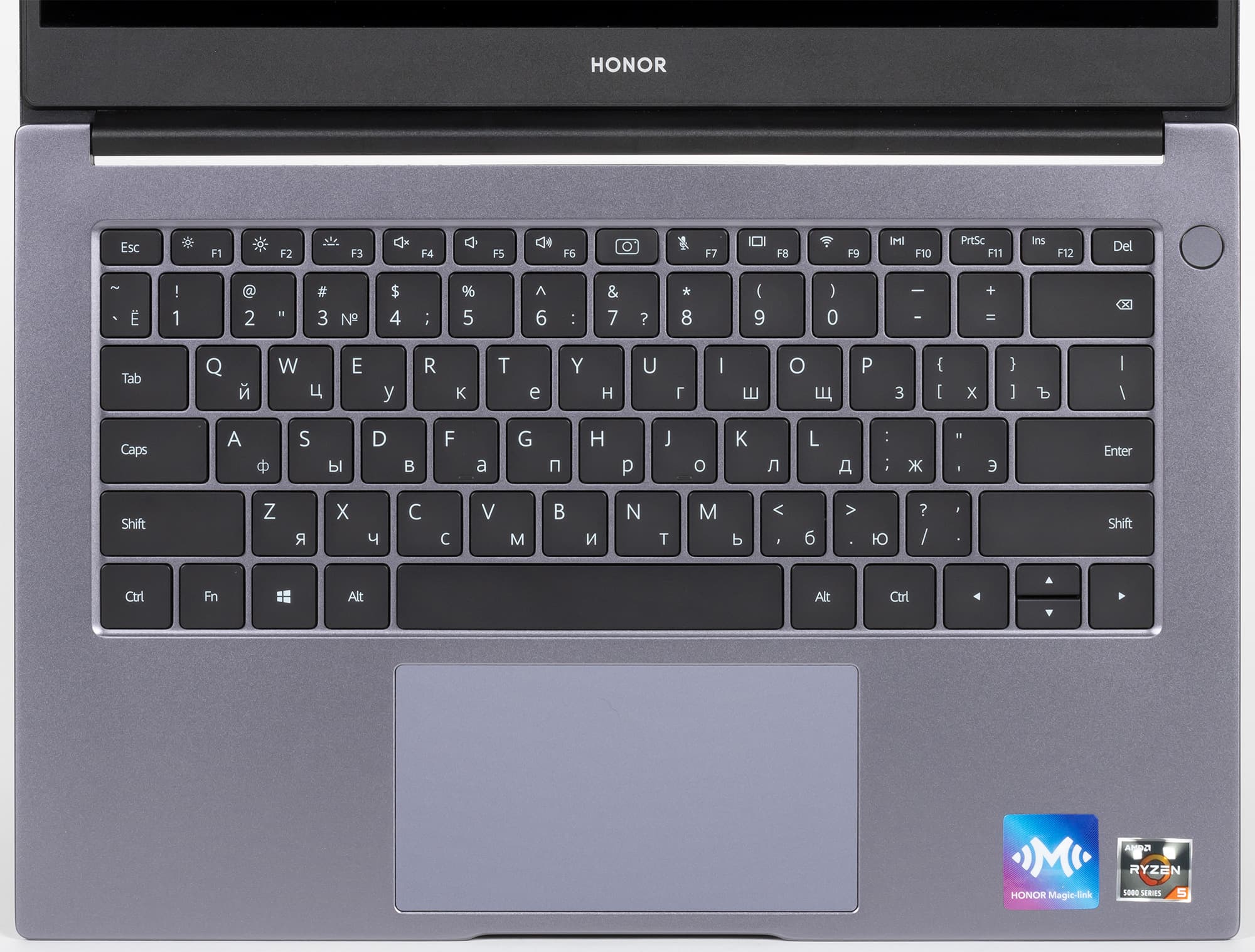 Ввиду того, что размеры Honor MagicBook 14 меньше, отсутствие цифрового блока на клавиатуре записать в минусы ноутбуку невозможно, здесь его разместить действительно негде. А вот столбик клавиш, включающий как минимум PgUp и PgDn, мог бы удачно вписаться на рабочую панель, но это мы, скорее всего, увидим у Honor только еще через пару-тройку поколений.