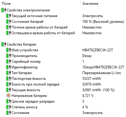 По данным HWinfo64, емкость аккумулятора при полном заряде составляла почти 53 Вт·ч, что на 5,4% ниже паспортной.