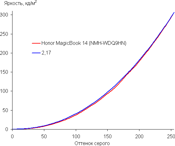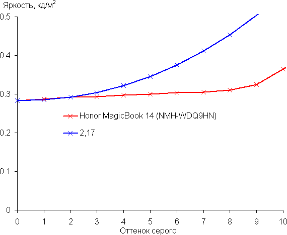 Рост прироста яркости довольно равномерный, и формально каждый следующий оттенок ярче предыдущего. Однако в самой темной области визуально первый оттенок серого по яркости от черного не отличается, да и последующие различаются плохо, так как прирост яркости в тенях медленный: