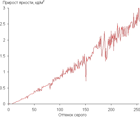 Далее мы измерили яркость 256 оттенков серого (от 0, 0, 0 до 255, 255, 255). График ниже показывает прирост (не абсолютное значение!) яркости между соседними полутонами: