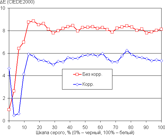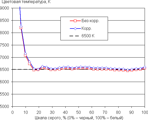 Баланс оттенков на шкале серого хороший (графики Без корр. на рисунках ниже), так как цветовая температура достаточно близка к стандартным 6500 К, и отклонение от спектра абсолютно черного тела (ΔE) ниже 10, что для потребительского устройства считается приемлемым показателем. При этом цветовая температура и ΔE мало изменяются от оттенка к оттенку — это положительно сказывается на визуальной оценке цветового баланса. (Самые темные области шкалы серого можно не учитывать, так как там баланс цветов не имеет большого значения, да и погрешность измерений цветовых характеристик на низкой яркости большая.)