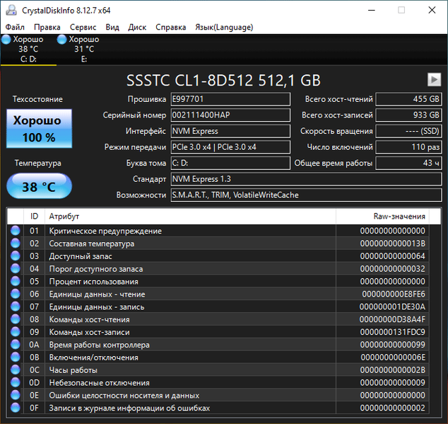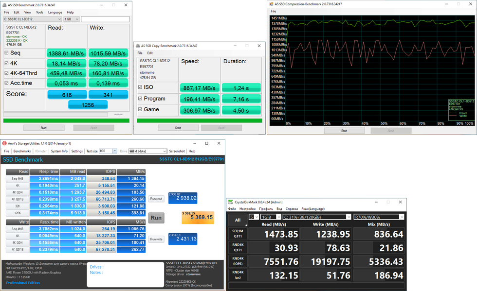 | Накопитель | 1×SSD 512 ГБ (SSSTC CL1-8D512, M.2 2280, NVMe 1.3, PCIe 3.0 x4) | |
