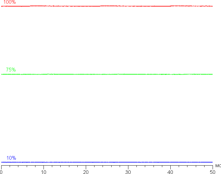 На любом уровне яркости значимая модуляция подсветки отсутствует, поэтому нет и никакого мерцания экрана. В доказательство приведем графики зависимости яркости (вертикальная ось) от времени (горизонтальная ось) при различных значениях настройки яркости: