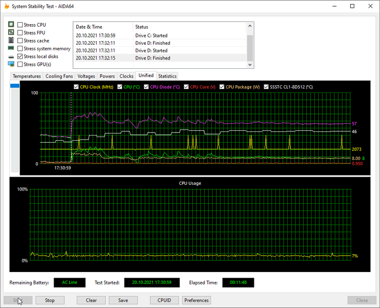 А здесь уже обратная картина. Если в MagicBook 15 при работе от аккумулятора процессор стабилизировался на частоте 1,9 ГГц при 12 Вт и 49 °C, то в MagicBook 14 точно такой же AMD Ryzen 5500U работает на 2,35 ГГц при примерно 17 Вт и 66 °C. Добавим, что в этом случае ноутбук работает очень тихо.