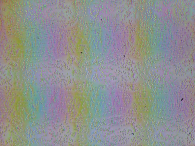 Зерно этих дефектов в несколько раз меньше размеров субпикселей (масштаб этих двух фотографий примерно одинаковый), поэтому фокусировка на микродефектах и «перескок» фокуса по субпикселям при изменении угла зрения выражены слабо, из-за этого нет и «кристаллического» эффекта.
