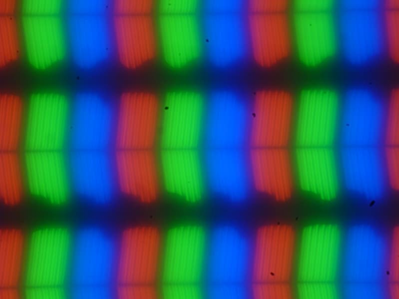 В этом ноутбуке используется матрица типа IPS. Микрофотографии демонстрируют типичную для IPS структуру субпикселей (черные точки — это пыль на матрице фотоаппарата):
