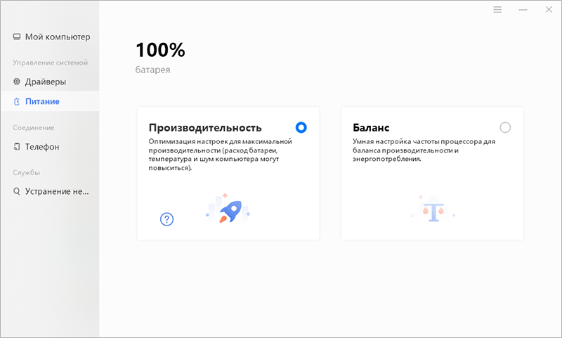 При работе от адаптера питания у ноутбука доступен выбор из двух режимов: производительного и сбалансированного. Они переключаются либо сочетанием клавиш Fn+P на клавиатуре, либо через установленное программное обеспечение.
