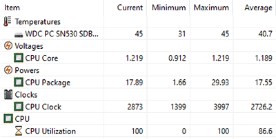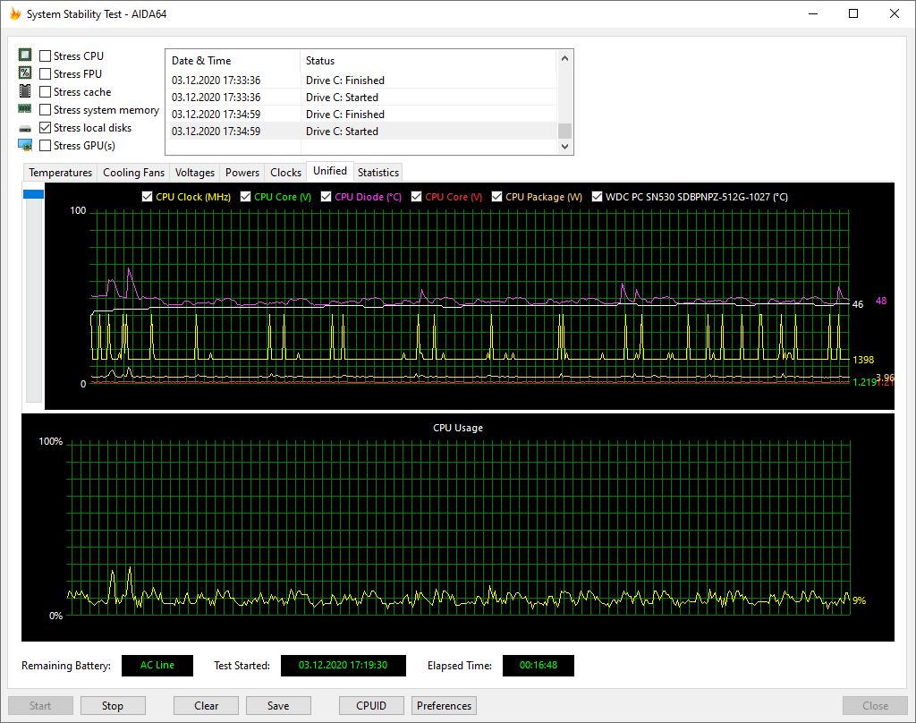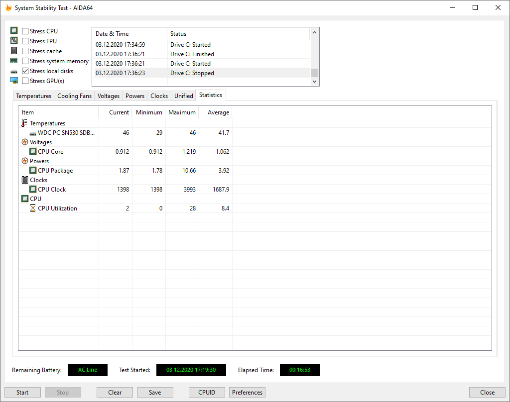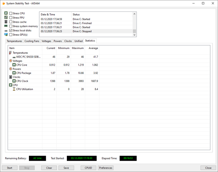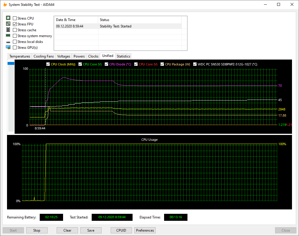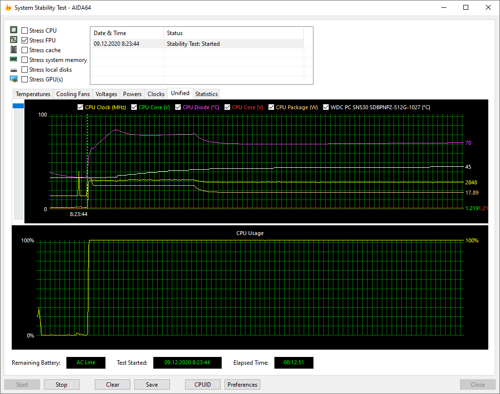 Эффективность охлаждения центрального процессора в ноутбуке мы тестировали с помощью стресс-теста FPU из утилиты AIDA64 Extreme, который задействует ресурсоемкие инструкции AVX. Температура в помещении во время теста составляла 25 °C. Ноутбук был протестирован как при работе от адаптера питания и электросети, так и при работе от аккумулятора. Результаты получились следующие.