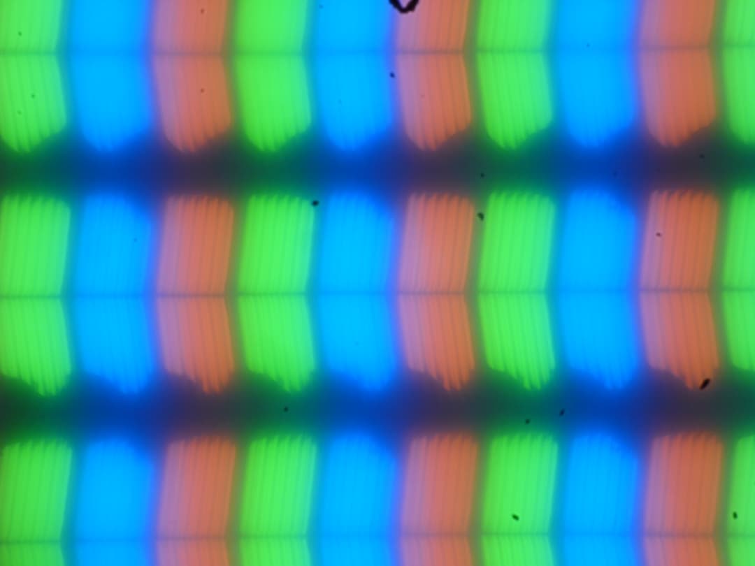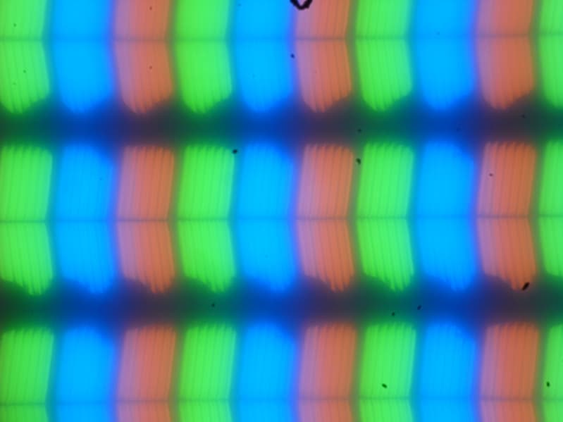 В этом ноутбуке используется матрица типа IPS. Микрофотографии демонстрируют типичную для IPS структуру субпикселей (черные точки — это пыль на матрице фотоаппарата):