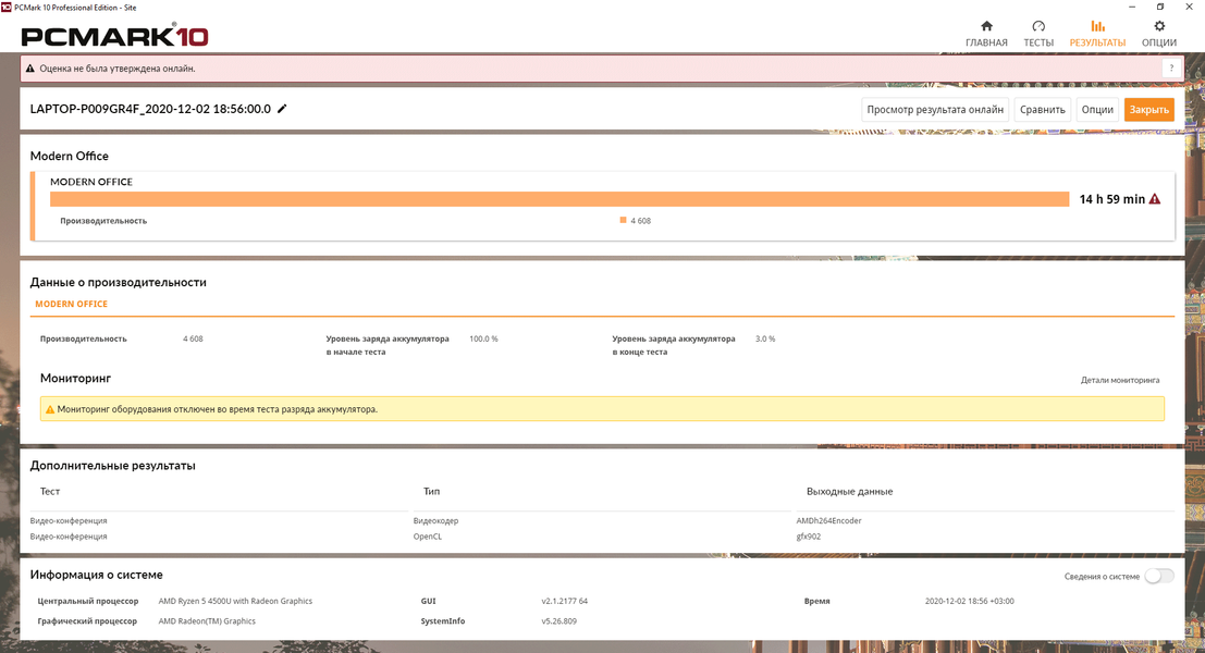 Замена центрального процессора на более энергоэффективный заметно повлияла на общую автономность ноутбука. Ее мы, как обычно, тестировали при яркости дисплея на уровне 100 кд/м² (в данном случае это соответствует 61%). В тестах автономности в пакете PCMark’10 Honor MagicBook 14 (NblL-WDQ9HN) оказался способен проработать в режиме «Modern Office» почти 15(!) часов, а в режиме «Gaming» — 2 часа и 18 минут.