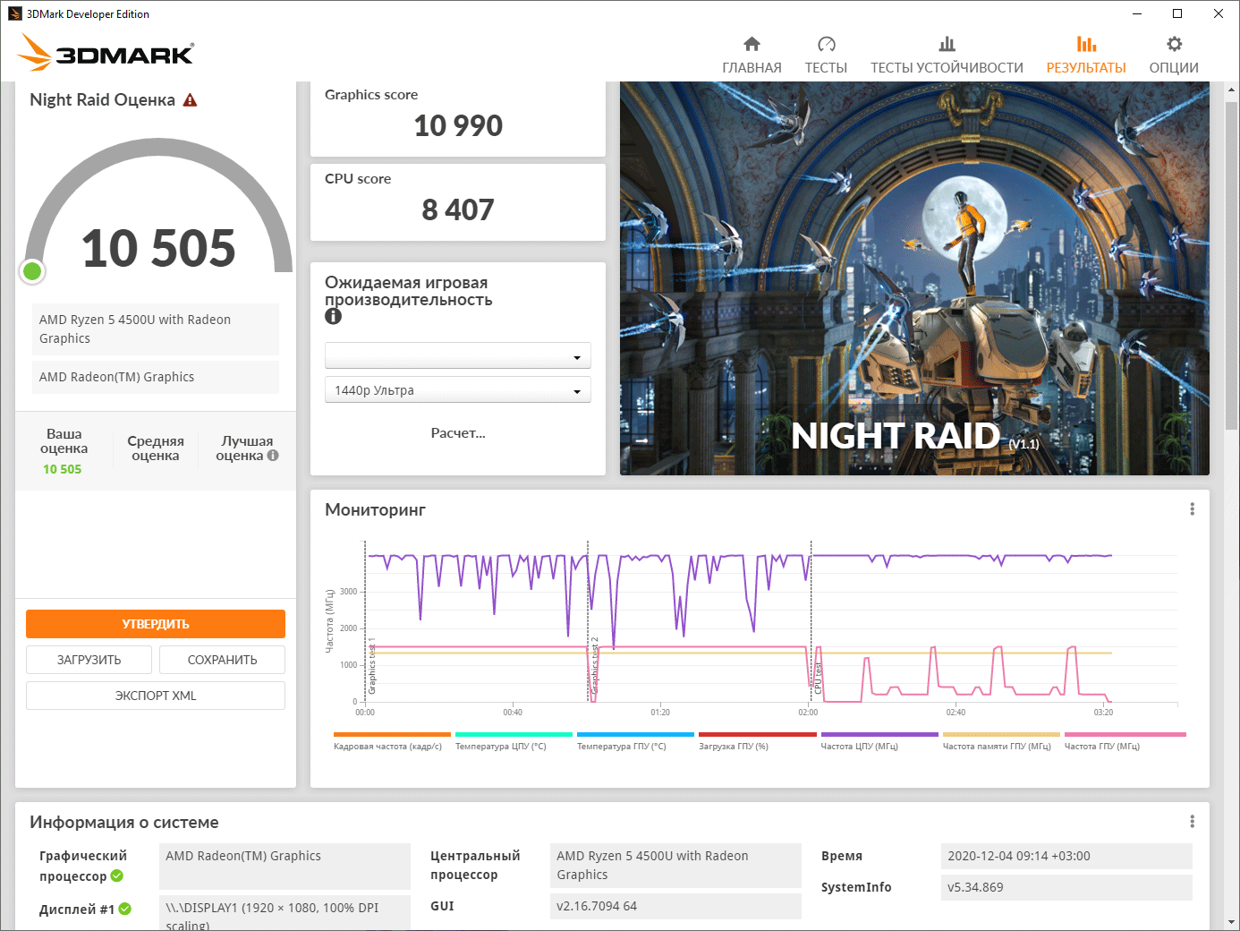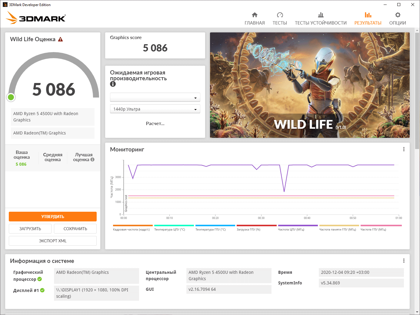Понятно, что ноутбук не игровой, на встроенном в процессор графическом ядре далеко не уедешь, хотя оно, конечно, лучше типичной встроенной графики мобильных процессоров Intel. Но просто для справки мы прогнали три теста бенчмарка 3DMark и тест World of Tanks enCore RT на средних настройках качества.