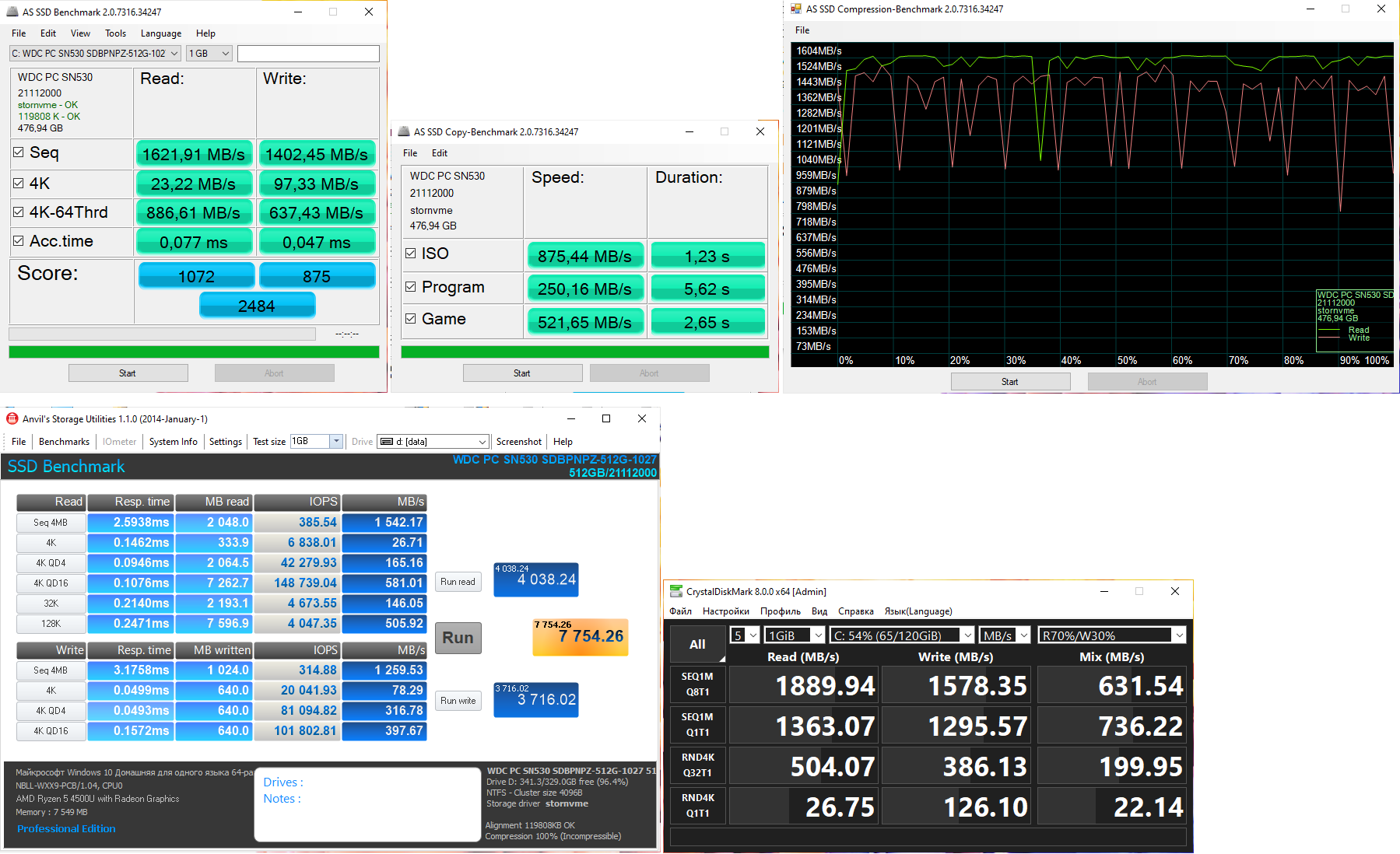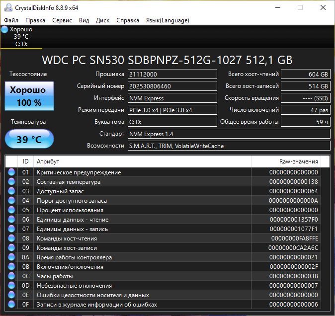 | Накопитель | 1×SSD 512 ГБ Western Digital SN530 (SDBPNPZ-512G-1027), M.2 2280, PCIe 3.0 x4 | |
