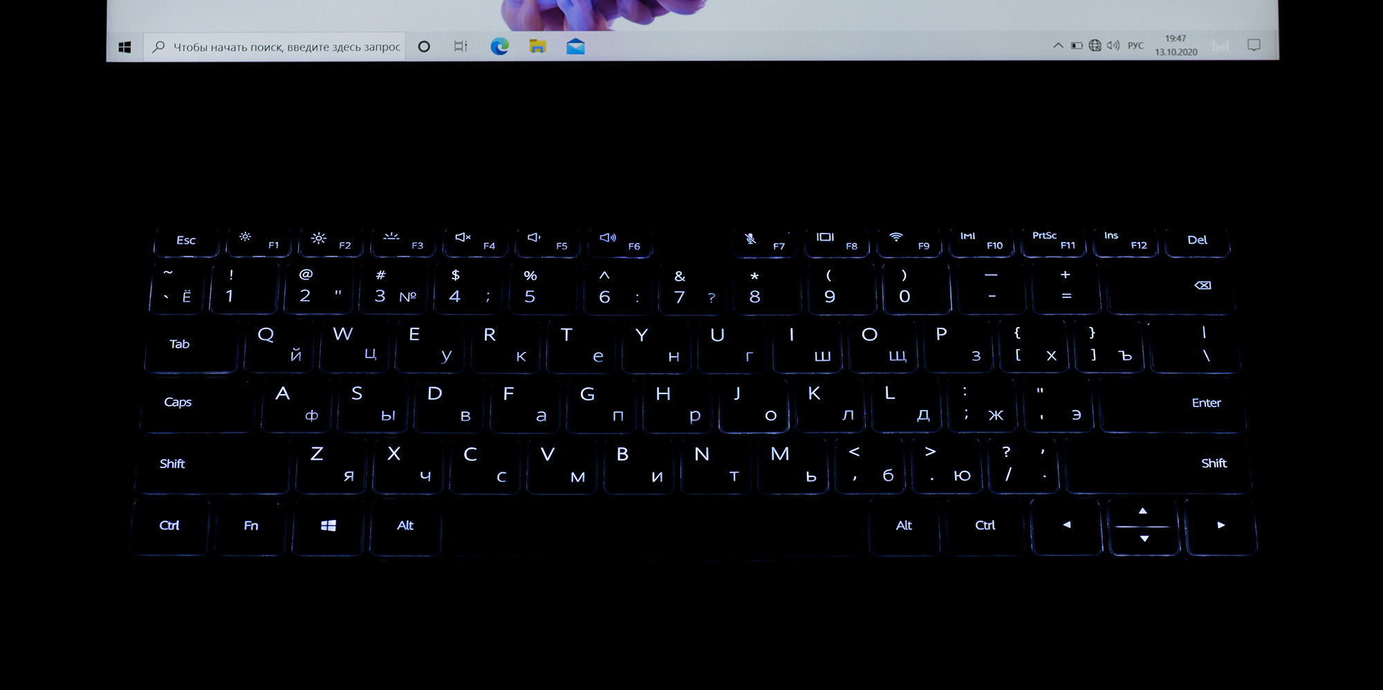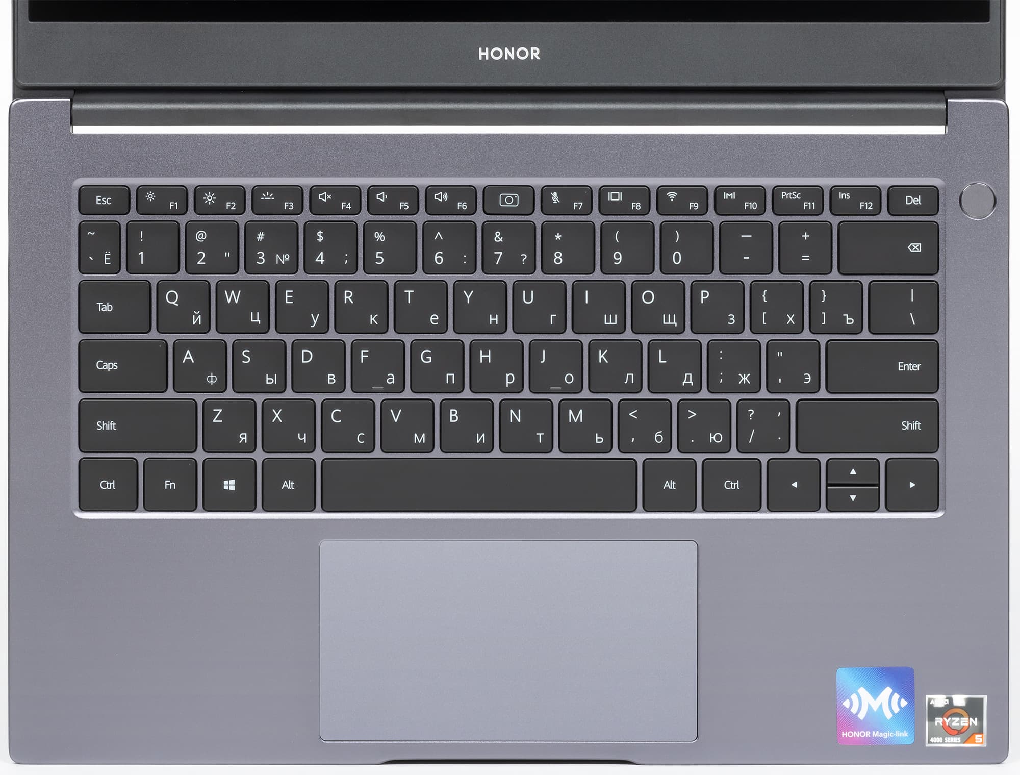 Если говорить про устройства ввода обновленного Honor MagicBook 14 (NblL-WDQ9HN), то говорить-то, в общем-то, и нечего, поскольку они не претерпели изменений от слова «совсем». Размеры основных клавиш клавиатуры мембранного типа равны 16,5×16,5 мм, функциональных — 15,5×8,5 мм. Стрелки вверх и вниз имеют уменьшенные размеры, что может вызвать неудобства в работе.