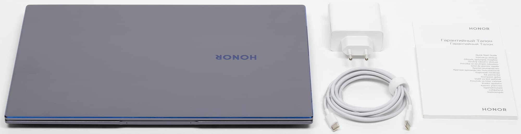 В комплекте с Honor MagicBook 14 идет компактный адаптер питания мощностью 65 Вт (20,0 В/3,25 A) с выходным разъемом USB Type-C и кабелем длиной 1,8 м. Точно такой же адаптер питания входил в комплект предыдущей модели 14-дюймового ноутбука Honor.