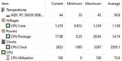 Хорошо видно, что работа ноутбука не зависит от режима его питания. В обоих случаях процессор стабилизируется на частоте 2,85 ГГц при температуре 70 °C, но при включении нагрузки она повышается почти до 90 градусов, а затем ее сбивает вентилятор системы охлаждения. При этом уровень шума ноутбука сравнительно невысокий, дискомфорта при работе за Honor MagicBook 14 не ощущается.