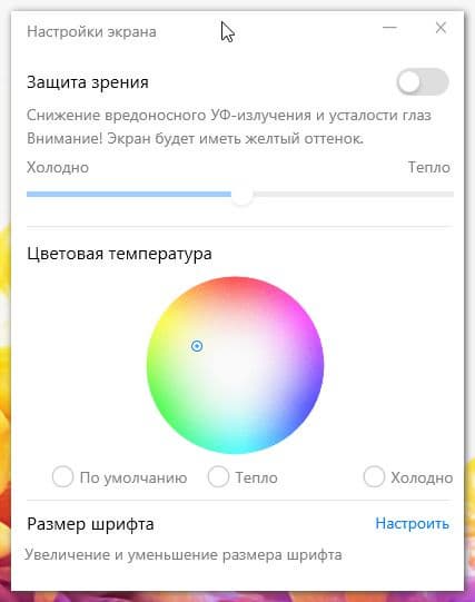 Включение опции Защита зрения снижает интенсивность синей компоненты, насколько именно — можно подправить ползунком (в Windows 10 соответствующая настройка и так есть). В любом случае, при работе за ноутбуком на ночь глядя лучше снизить яркость экрана до низкого, но еще комфортного уровня. Желтить картинку нет никакого смысла.