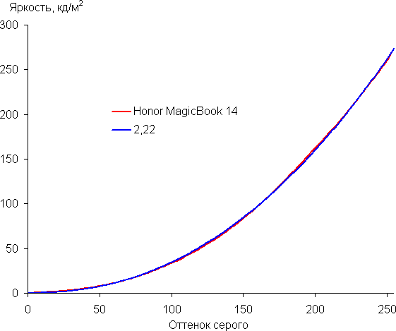 Аппроксимация полученной гамма-кривой дала показатель 2,22, что очень близко к стандартному значению 2,2, при этом реальная гамма-кривая немного отклоняется от аппроксимирующей степенной функции: