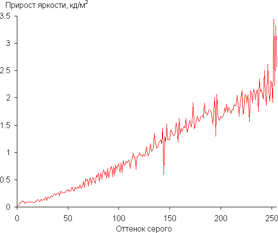 Далее мы измерили яркость 256 оттенков серого (от 0, 0, 0 до 255, 255, 255) при настройках по умолчанию. График ниже показывает прирост (не абсолютное значение!) яркости между соседними полутонами: