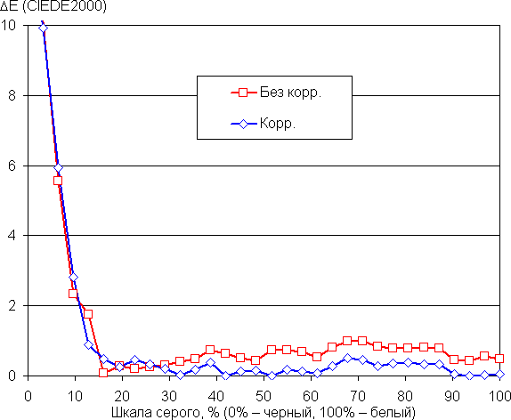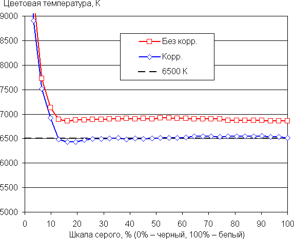 Баланс оттенков на шкале серого хороший (графики Без корр. на рисунках ниже), так как цветовая температура близка к стандартным 6500 К, а отклонение от спектра абсолютно черного тела (ΔE) даже ниже 2, что для потребительского устройства считается отличным показателем. При этом цветовая температура и ΔE мало изменяются от оттенка к оттенку — это положительно сказывается на визуальной оценке цветового баланса. (Самые темные области шкалы серого можно не учитывать, так как там баланс цветов не имеет большого значения, да и погрешность измерений цветовых характеристик на низкой яркости большая.)