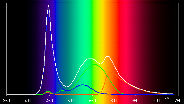 Такой спектр с относительно узким пиком синего и с широкими горбами зеленого и красного цветов характерен для экранов, в которых используется белая светодиодная подсветка с синим излучателем и желтым люминофором. Спектры показывают, что светофильтры матрицы значительно подмешивают компоненты друг к другу, что и сужает цветовой охват.