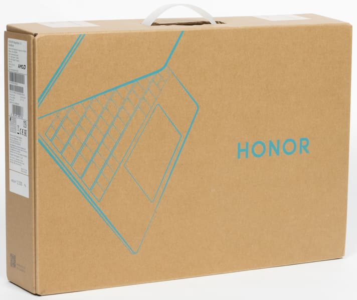 Упаковка, в которой поставляется ноутбук, представляет собой простую картонную коробку с пластиковой ручкой для переноски. Оформлена она в стиле минимализма, а из полезной информации выделим наклейку с краткой конфигурацией ноутбука с одного из торцов коробки.
