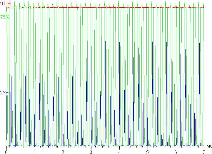 Яркость регулируется с помощью ШИМ, однако частота модуляции очень высокая, порядка 6 кГц, поэтому никакого мерцания не видно ни при каких обстоятельствах, также наличие модуляции не выявляется в тесте на стробоскопический эффект. Приведем графики зависимости яркости (вертикальная ось) от времени (горизонтальная ось) при различных значениях настройки яркости: