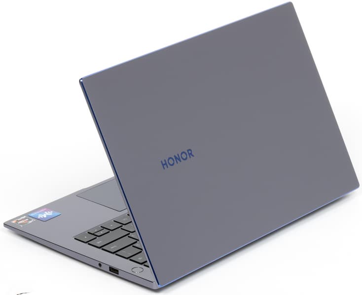 Внешне обновленный Honor MagicBook 14 не претерпел изменений. Все тот же цвет с оригинальным названием «Космический серый» и все те же алюминиевые панели с лазурно-голубой кромкой, придающей корпусу нотки премиальности. Единственное найденное отличие — это замена надписи «MagicBook» на широкой нижней рамке экрана на «Honor».
