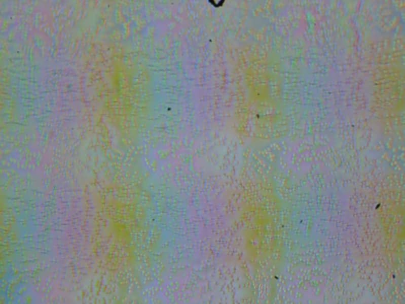 Зерно этих дефектов в несколько раз меньше размеров субпикселей (масштаб этих двух фотографий примерно одинаковый), поэтому фокусировка на микродефектах и «перескок» фокуса по субпикселям при изменении угла зрения выражены слабо, из-за этого нет и «кристаллического» эффекта.