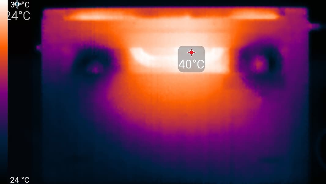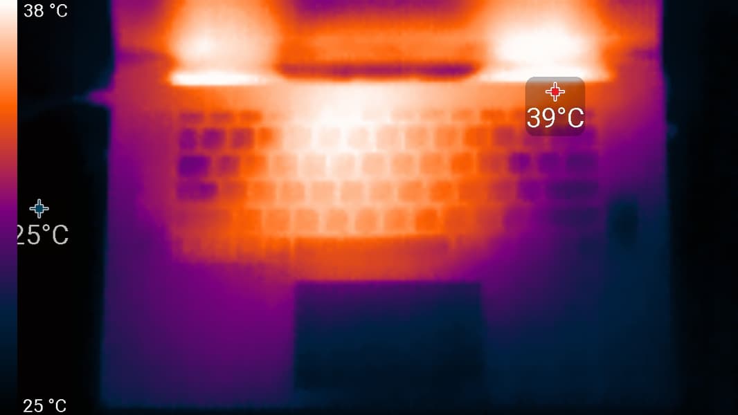 Ниже приведены термоснимки, полученные после долговременной работы ноутбука под максимальной нагрузкой на CPU и GPU (профиль Производительность; используется комплектный блок питания):