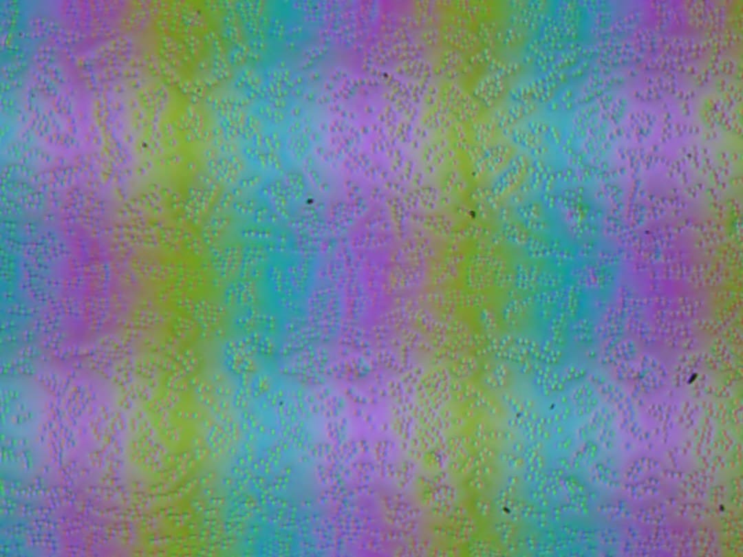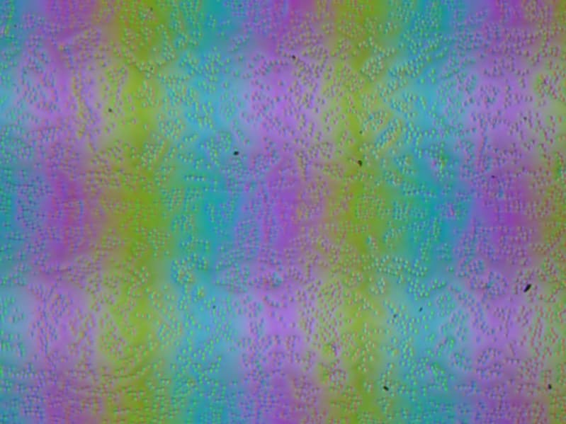 Зерно этих дефектов в несколько раз меньше размеров субпикселей (масштаб этих двух фотографий примерно одинаковый), поэтому фокусировка на микродефектах и «перескок» фокуса по субпикселям при изменении угла зрения выражены слабо, из-за этого нет и «кристаллического» эффекта.