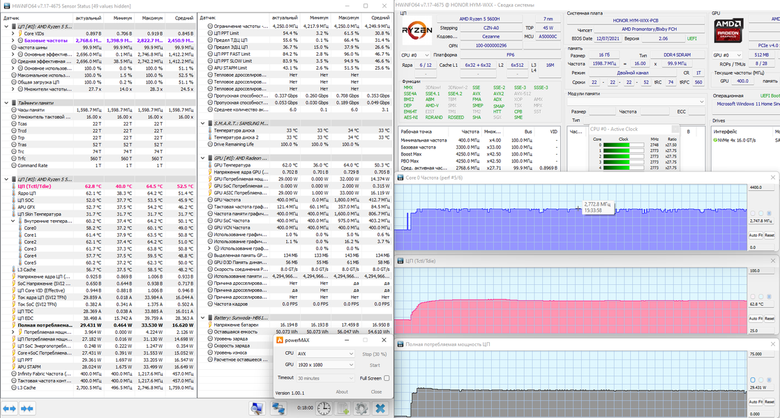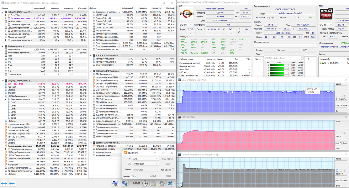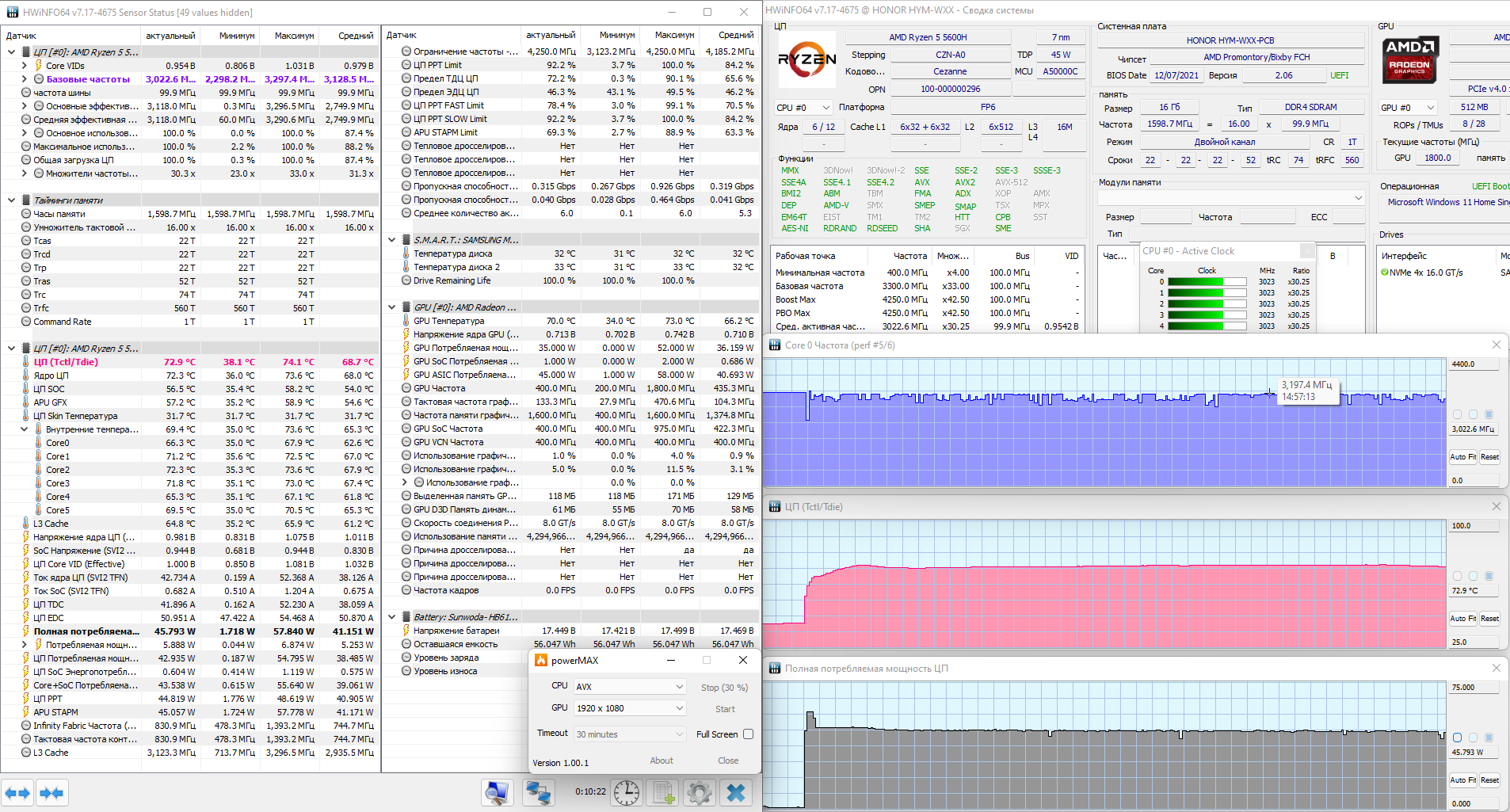Эффективность системы охлаждения нового MagicBook 16 мы проверили в стресс-тесте powerMax с использованием AVX-инструкций. Мониторинг осуществлялся с помощью утилиты HWinfo64. Результаты после стабилизации температур приведены на скриншотах.
