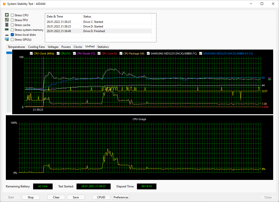 Два датчика на SSD Samsung показывали разную температуру под нагрузкой, но в любом случае температура не превысила отметку 60 °C.