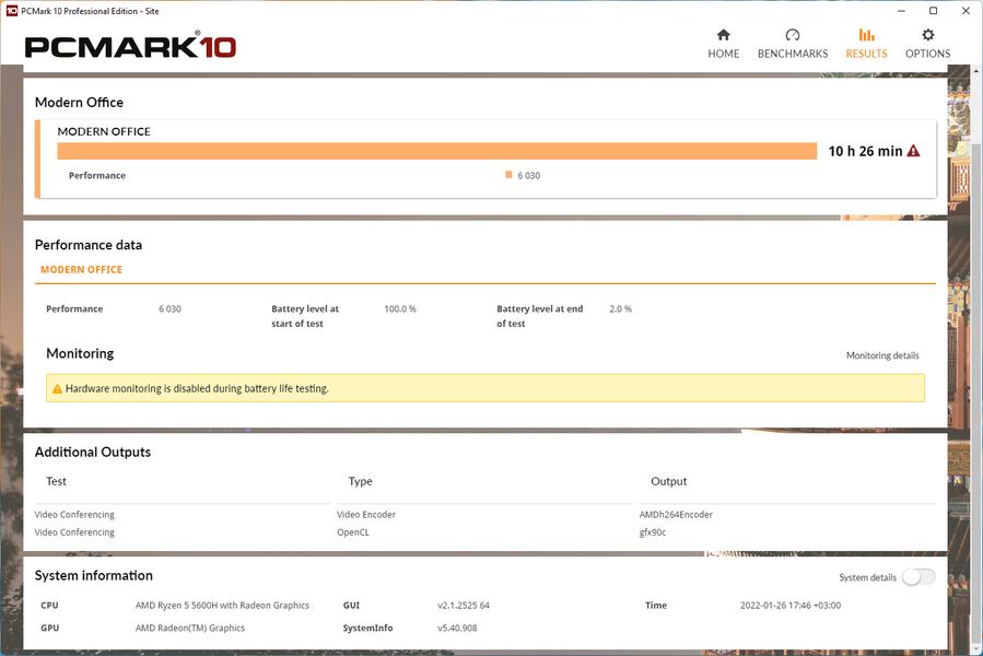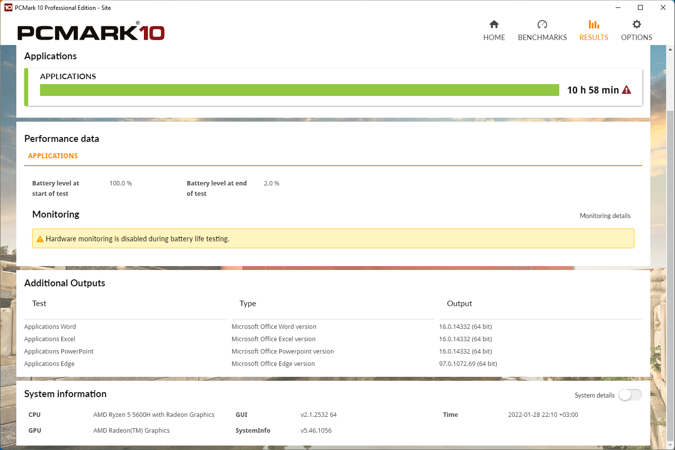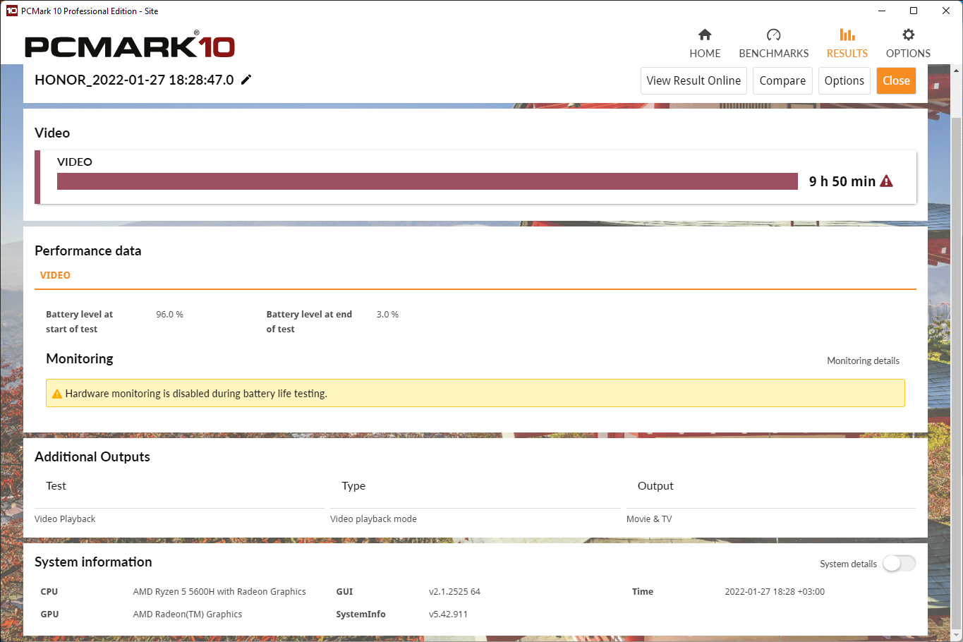 Тесты автономности Honor MagicBook 16 были проведены при яркости экрана 100 кд/м² (42% по шкале яркости) в пакете PCMark’10 при активных сетевых соединениях и громкости звука 20%. Их результаты приведены далее.