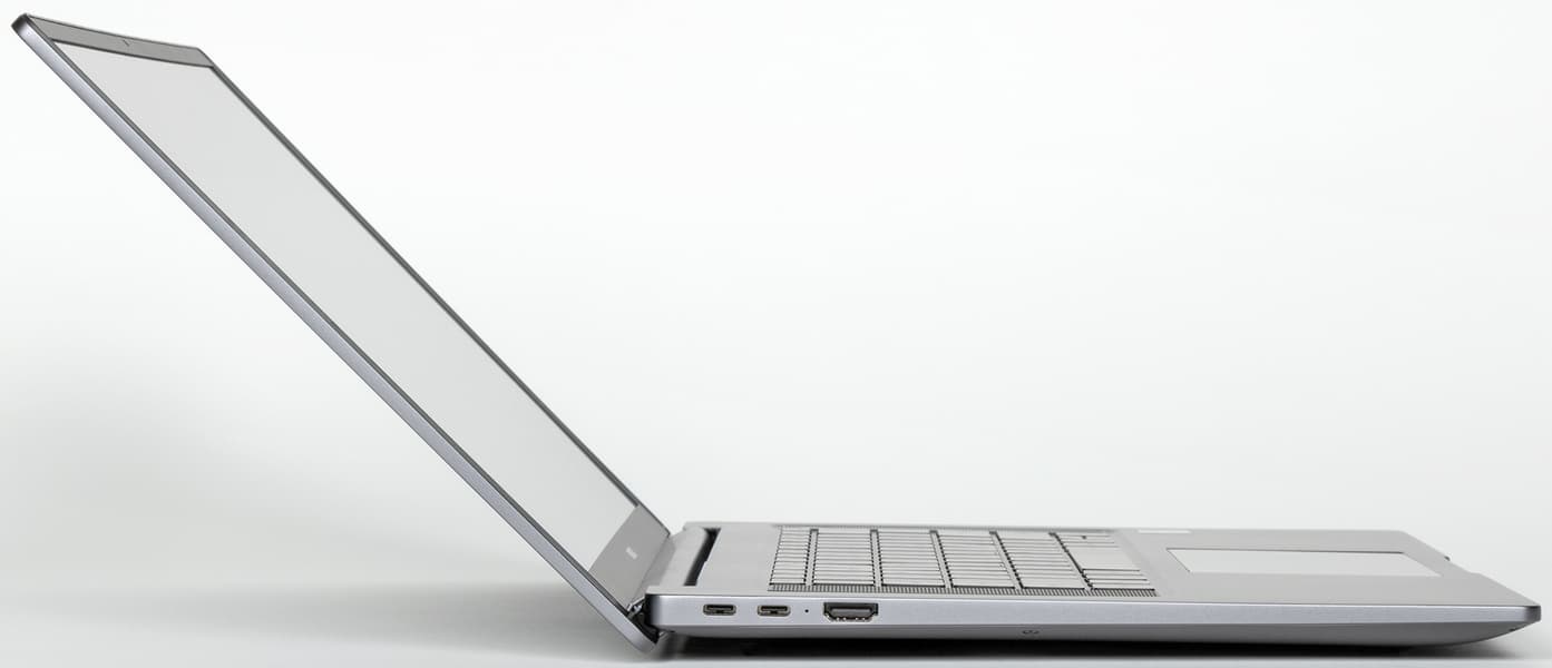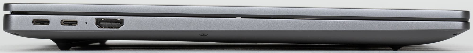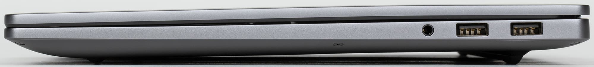 Слева размещены два порта USB 3.2 Gen1 Type-C (поддержка обратной зарядки и DisplayPort в характеристиках не заявлена), индикатор заряда и видеовыход HDMI 2.0, а справа — универсальный «миниджек» для микрофона/наушников и два порта USB 3.2 Gen1 Type-A.