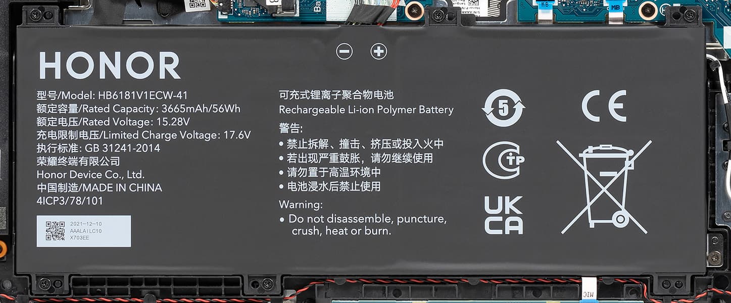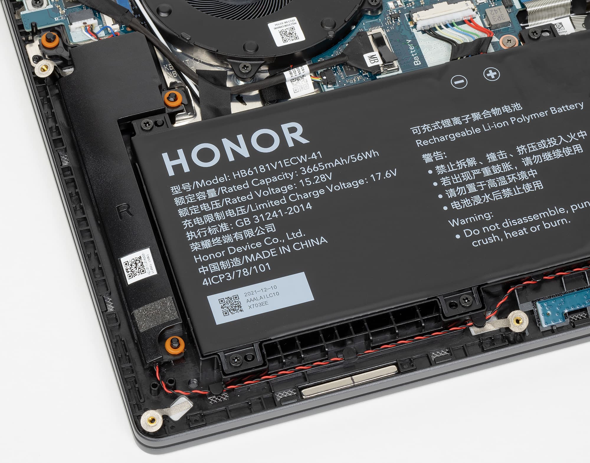 Honor MagicBook 16 оснащен литий-полимерным аккумулятором емкостью 56 Вт·ч (3665 мА·ч).