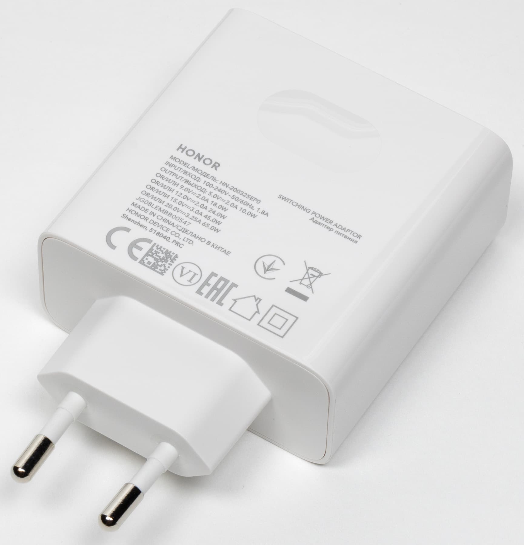 Заряжается аккумулятор комплектным адаптером HN-200325EP0 с максимальной мощностью 65 ватт. Адаптер компактный и легкий (156 г + кабель 40 г), поэтому его удобно носить с собой.