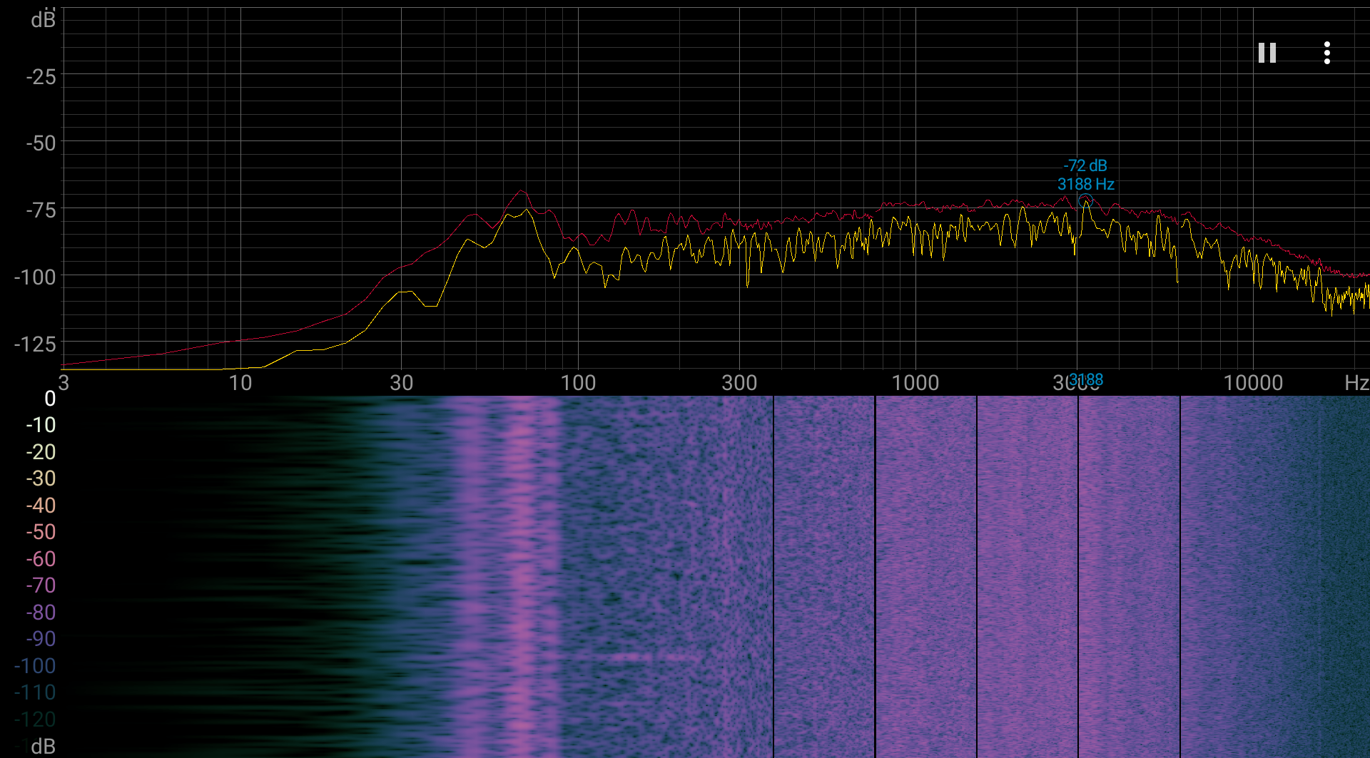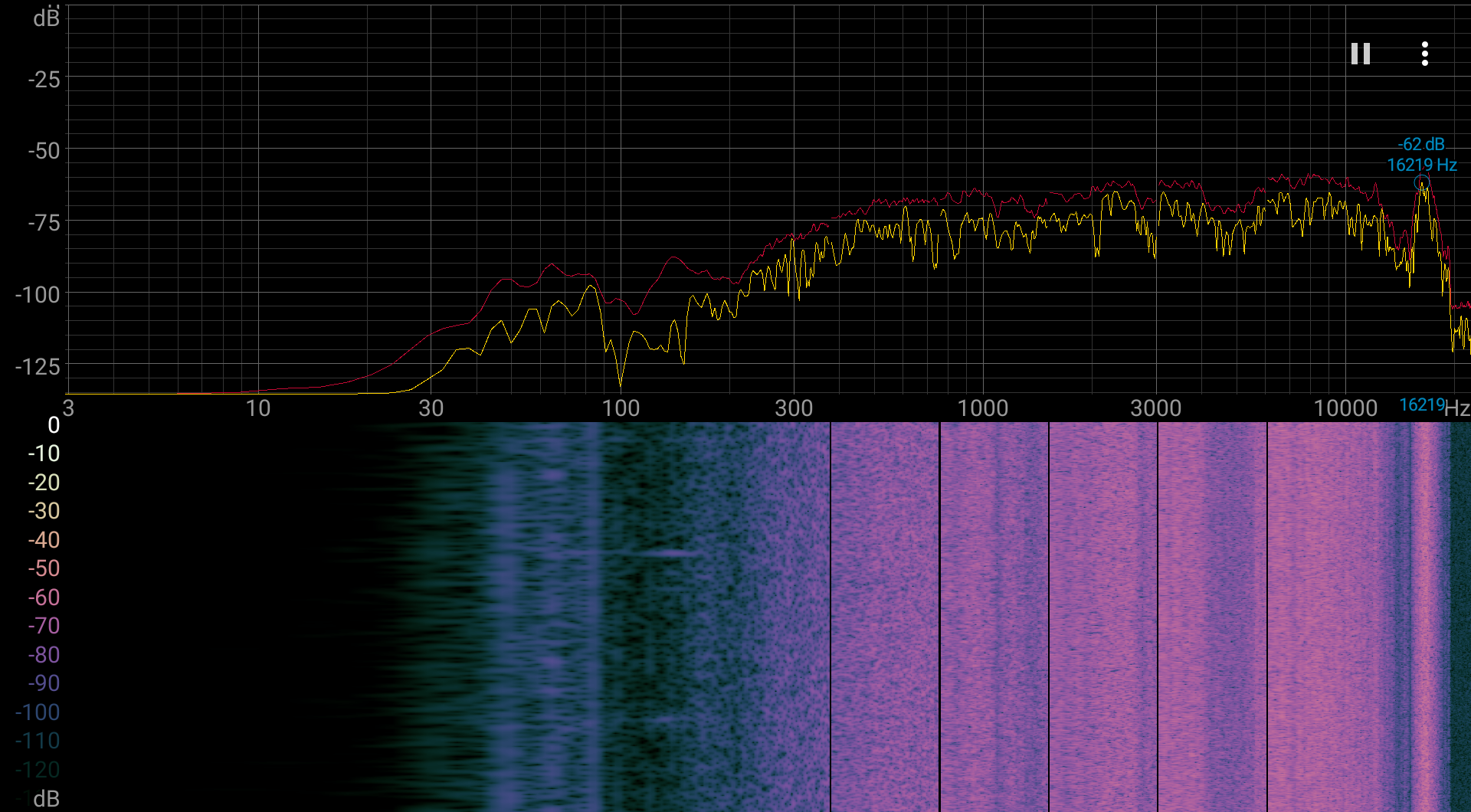 Спектрограмма белого шума показывает, что выраженных резонансных пиков в звучании динамиков нет, низких частот тоже нет, в области между средними и высокими частотами есть небольшой провал, а около 16 кГц громкость неожиданно повышается: