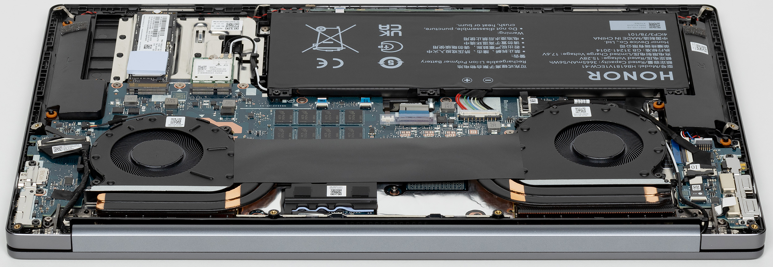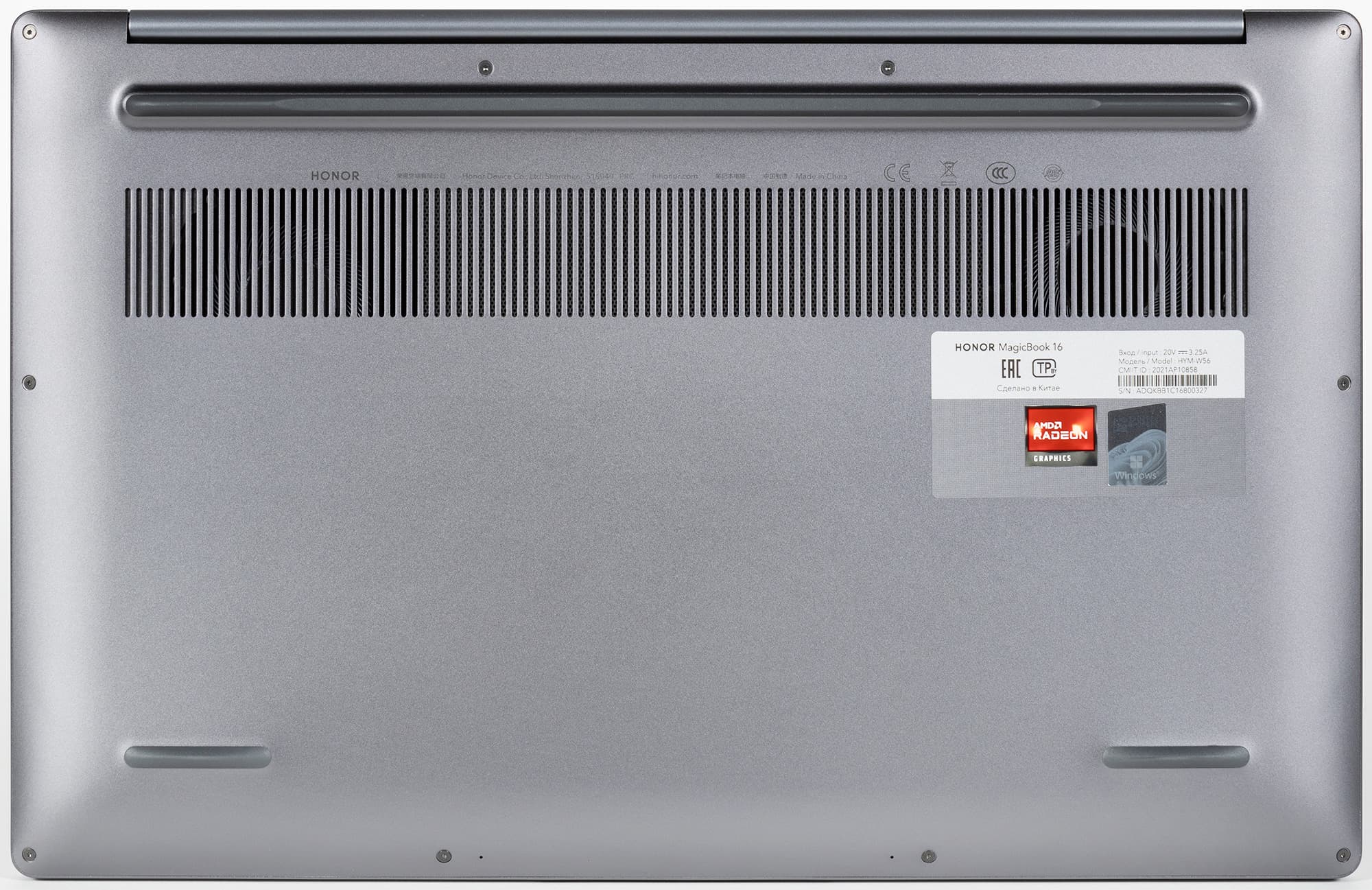 Система охлаждения MagicBook 16 в сравнении с кулером MagicBook Pro не изменилась принципиально (воздух по-прежнему поступает через решетку снизу и выбрасывается через задний торец при открытой крышке), но претерпела конструктивные изменения.