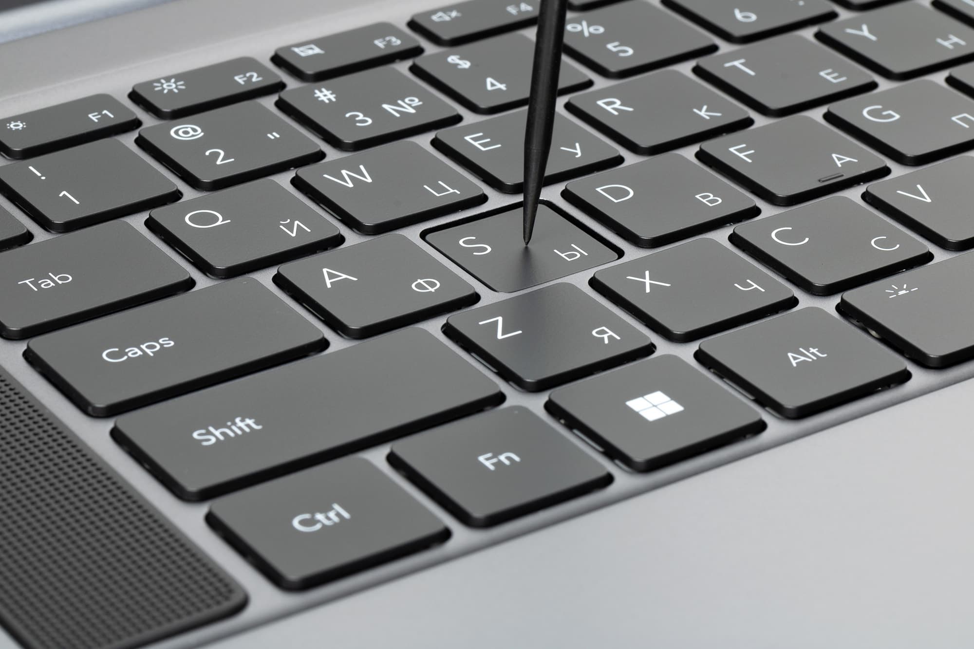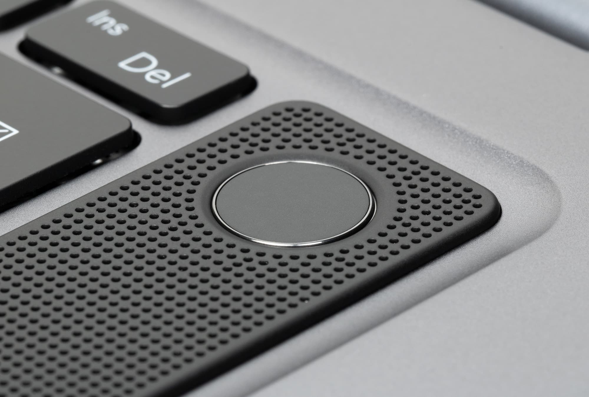 Кнопка включения ноутбука расположена в правом дальнем углу рабочей панели и оснащена сканером отпечатков пальцев.