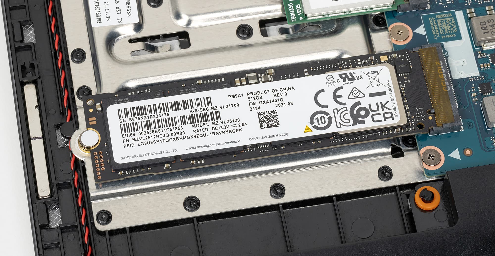 Шасси ноутбука оснащено только одним посадочным местом под накопитель (слот M.2), в котором установлен SSD с интерфейсом PCIe 3.0 x4 объемом 512 ГБ (модель Samsung MZVL2512HCJQ).