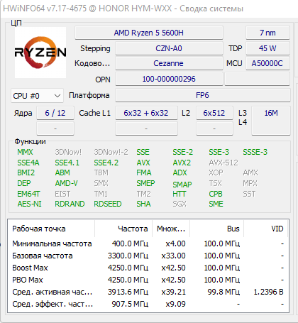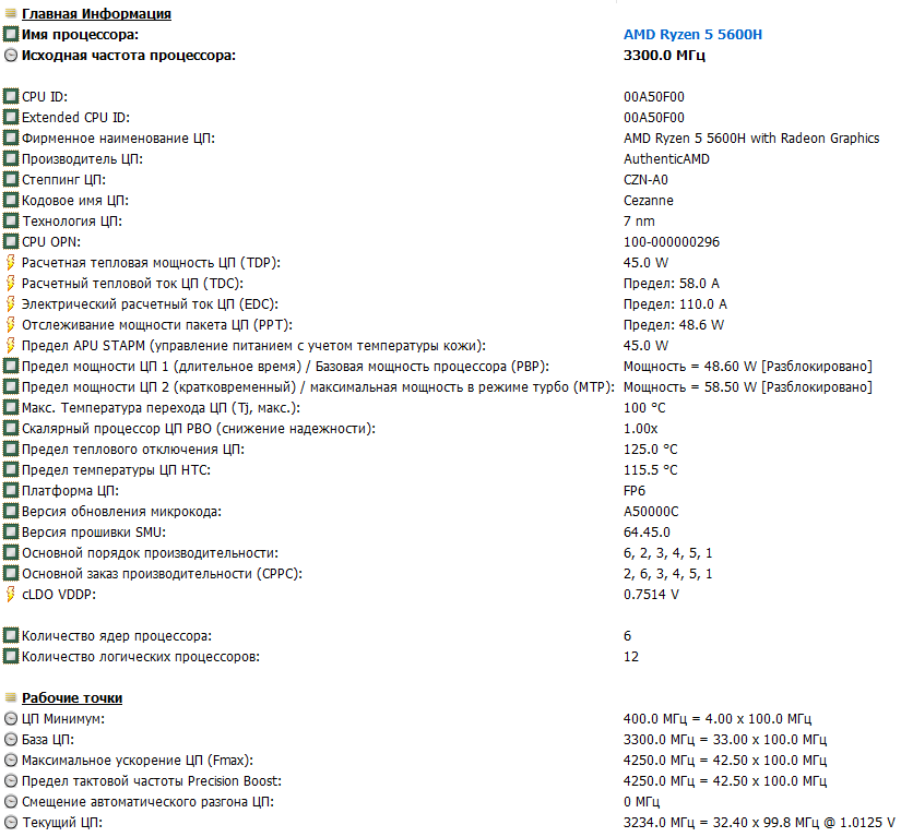 | Центральный процессор | AMD Ryzen 5 5600H (Cezanne, 7 нм FinFET, 6 ядер/12 потоков, 3,3—4,2 ГГц, L3-кэш 16 МБ, TDP 35—54 Вт) | |