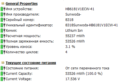 По данным диагностических утилит, полная заряженная емкость аккумулятора составляет 53,5 Вт·ч.