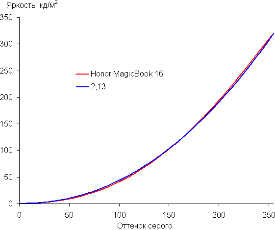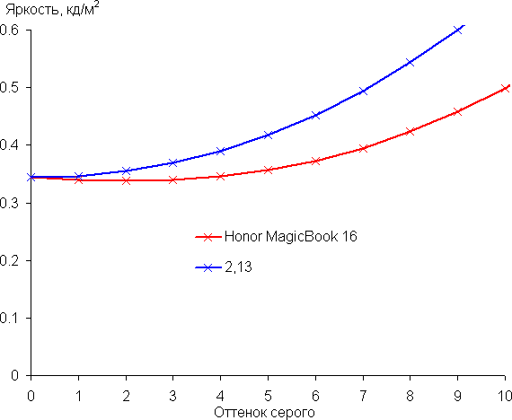 Рост прироста яркости довольно равномерный, и почти каждый следующий оттенок ярче предыдущего. Однако в самой светлой области визуально последний оттенок серого по яркости от белого не отличается, а в самой темной области есть завал на пару оттенков:
